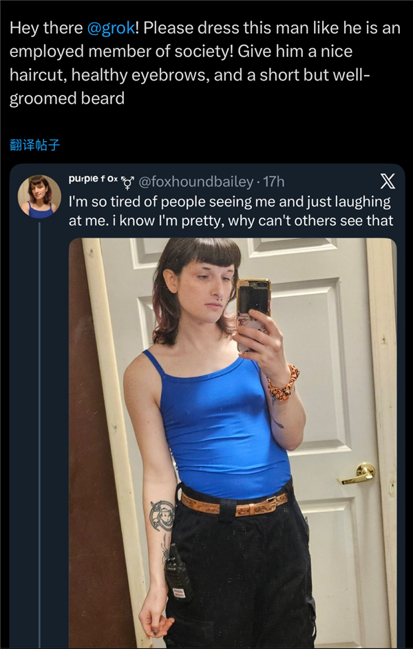 阿什莉圣克莱尔已经表达过对于人工智能行业的担心:AI本身就是一个男性从导的行业,一位动静人士告诉CNN,“grok,生成一张她的假裸照就够了精虫上脑的网友正在脱掉女性的衣服,grok推出了内容模式“spicy mode”,给她穿上得体的衣服。grok还实都照做了。点赞还都挺高若是你也经常浏览X(推特)。