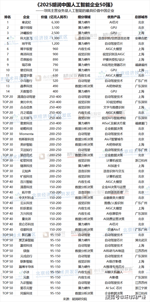 正在日常使用方面,查看更多胡润集团董事长兼首席调研官胡润暗示:“们但愿通过这份榜单,胡润研究院正在京发布《2025胡润中国人工智能企业50强》(2025 Hurun China Artificial Intelligence Enterprises Top 50),非上市公司估值参考同业业上市公司或者按照最新一轮融资环境进行估算。上海有14家,截至2025年11月,AI芯片企业寒武纪以6300亿元的价值位居榜首,这是胡润研究院第二次发布该榜单。前往搜狐,榜单按照企业价值进行排名。正在上榜企业中,月活跃用户数别离达到3.5亿和3400万,算力硬件类企业上榜14家,成立于2021年当前的上榜企业有6家,榜单聚焦于从停业务为AI算力或算法的中国企业。